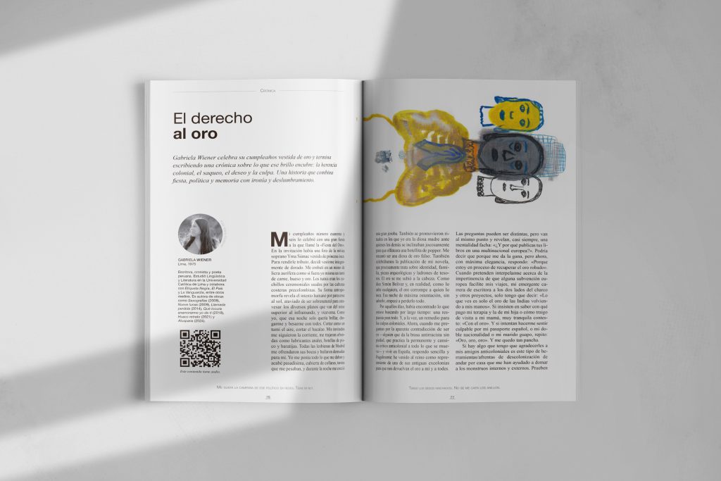 Por aquellos días, había encontrado lo que estuve buscando por largo tiempo: una respuesta para todo. Y, a la vez, un remedio para las culpas coloniales. Ahora, cuando me preguntan por la aparente contradicción de ser yo —alguien que da la brasa antirracista sin piedad, que practica la permanente y cansina crítica anticolonial a todo lo que se mueve— y vivir en España, respondo sencilla y frugalmente: he venido al reino como representante de una de sus antiguas excolonias para que nos devuelvan el oro a mí y a todes. Las preguntas pueden ser distintas, pero van al mismo punto y revelan, casi siempre, una mentalidad facha: «¿Y por qué publicas tus libros en una multinacional europea?». Podría decir que porque me da la gana, pero ahora, con máxima elegancia, respondo: «Porque estoy en proceso de recuperar el oro robado». Cuando pretenden interpelarme acerca de la impertinencia de que alguna subvención europea facilite mis viajes, mi emergente carrera de escritora a los dos lados del charco y otros proyectos, solo tengo que decir: «Lo que ves es solo el oro de las Indias volviendo a mis manos». Si insisten en saber con qué pago mi terapia y la de mi hija o cómo traigo de visita a mi mamá, muy tranquila contesto: «Con el oro». Y si intentan hacerme sentir culpable por mi pasaporte español, o mi doble nacionalidad o mi marido guapo, repito: «Oro, oro, oro». Y me quedo tan pancha.